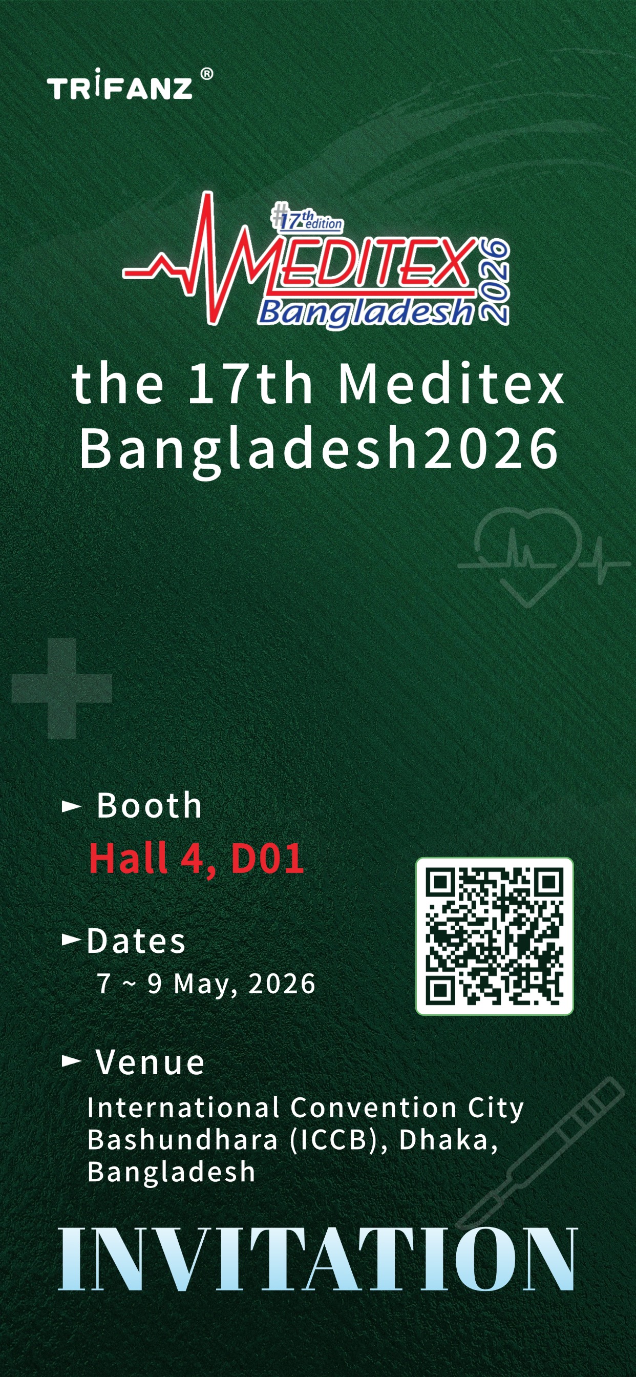 Hangzhou Trifanz Medical Equipment Co., Ltd. invita cordialmente a amigos de todos los sectores a visitar el stand D01 en el pabellón 4 para explorar juntos nuevas oportunidades en el mercado médico del sur de Asia.